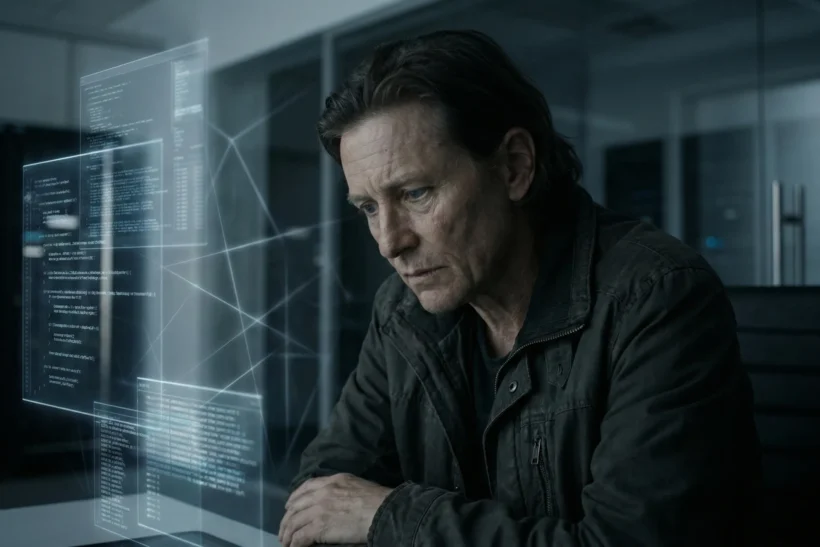A man wearing a futuristic VR headset looking thoughtful, symbolizing the uncertainty and human reflection surrounding the AI bubble and technology trends in 2025.